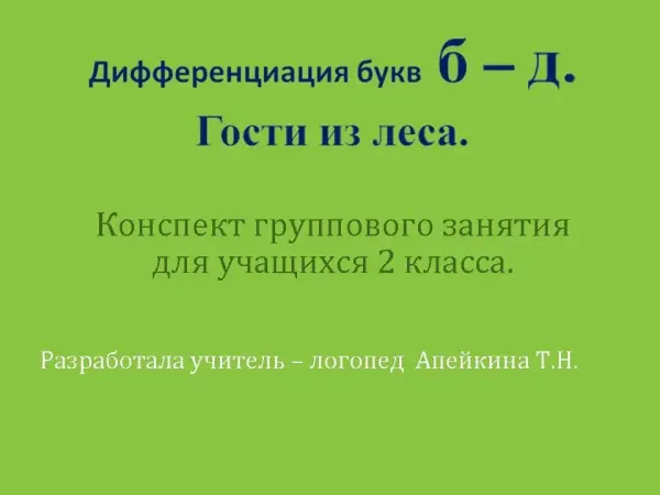 Конспект группового логопедического занятия для учащихся 2-го и 3-го классов с оптической дисграфией. На занятии дети учатся сравнивать буквы б–д по начертанию, соотносить эти буквы с символами, дифференцировать буквы изолированно, в слогах, в словах, словосочетаниях, предложениях, развивают слуховое внимание, память, логическое мышление, зрительное и слуховое внимание.