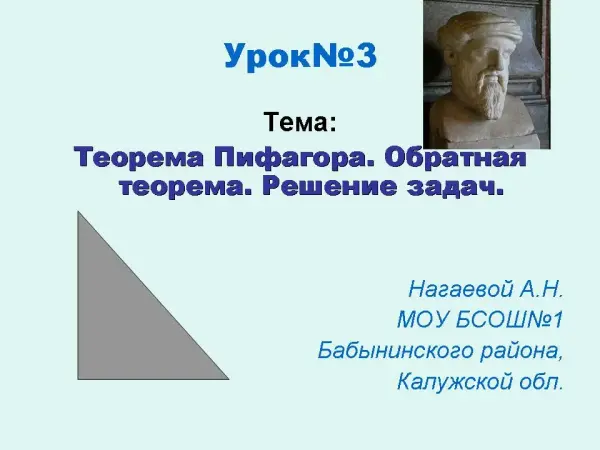 Третий урок по теме. Учащиеся уже имеют навыки применения прямой и обратной теоремы в решении задач. Цель: закрепление умений и навыков в решение задач на более высоком уровне. Опора на исторический материал расширяет кругозор учащихся. Учащиеся рассматривают другие доказательства Теоремы, развивается интерес к научной деятельности. В конце урока проходит самостоятельная работа с последующей самопроверкой.