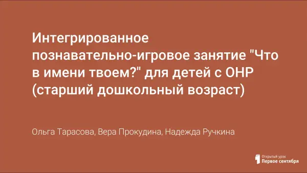 Представленное интегрированное познавательно-игровое занятие для детей с ОНР «Что в имени твоем?» помогает решать задачи по совершенствованию всех компонентов речи при помощи нетрадиционных методов и приемов, формировать у ребенка позитивное отношение к своему «Я», стимулировать творческое самовыражение. Занятие проводят воспитатель, учитель-логопед и музыкальный руководитель.