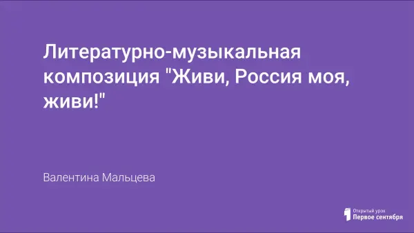 Представлен конспект литературно-музыкальной композиции «Живи, Россия, живи!» с использованием аудиозаписей песен, живой музыки и слайдов природы, памятников. Учащиеся знакомятся с лирикой и музыкой России.