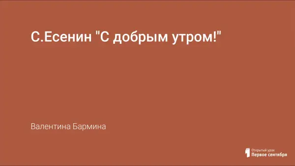 Учащиеся знакомятся с поэтическим произведением С.Есенина «С добрым утром!»; учатся чувствовать и понимать образный язык поэтического произведения; учатся анализировать поэтическое произведение. Урок способствует развитию эмоционально-чувственного отношения к поэзии.