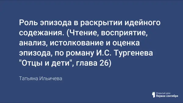 Цель урока: проанализировать эпизод главы 26 романа И.С. Тургенева «Отцы и дети», объяснить мотивы поведения Базарова, определить значение сцены в идейном содержании романа. В ходе урока дается понятие словам «эпизод», «герой», «конфликт», отрабатывается навык анализа эпизода.