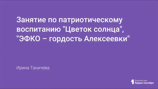Представлены два занятия по патриотическому воспитанию. Первое знакомит детей старшего дошкольного возраста со своим земляком, первооткрывателем подсолнечного масла Д.С. Бокаревым. Второе – с гордостью своего города – заводом «ЭФКО». Оба занятия посвященные подсолнечному маслу – гордости родного края, воспитывая интерес и любовь к родному краю, чувство гордости за свой край, развивают разговорную речь учащихся.