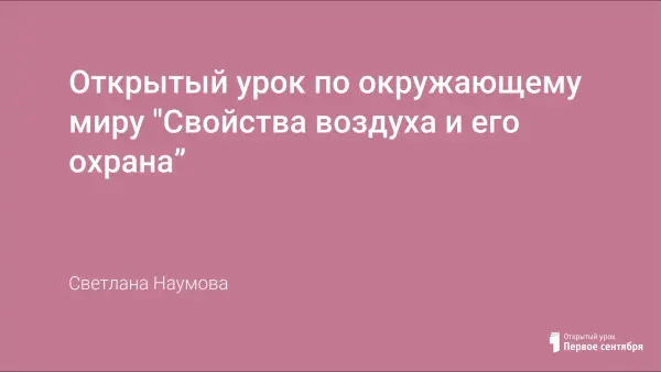 Открытый урок окружающего мира проводится с целью уточнить и расширить знания учащихся о значении воздуха для живых существ; познакомить с основными свойствами воздуха; систематизировать и обогатить представления о факторах загрязнения воздуха и мерах по охране его чистоты.