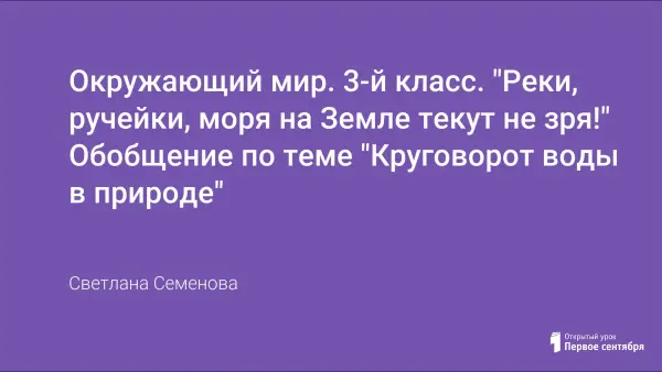 Цели урока: обобщить знания учащихся о значении воды для жизни человека, животных и растений; закрепить понятие о круговороте воды в природе; прививать основы экологических знаний.