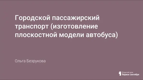 Представленный урок предполагает его реализацию в системе дополнительного образования детей, на уроках технологии в начальной школе в блоке "Техническое моделирование". При изготовлении плоскостной модели автобуса расширяется представление детей об особенностях городского пассажирского транспорта. Происходит формирование работы с материалами, прививается культура поведения в общественном транспорте. Развивается познавательная активность и творческое воображение.