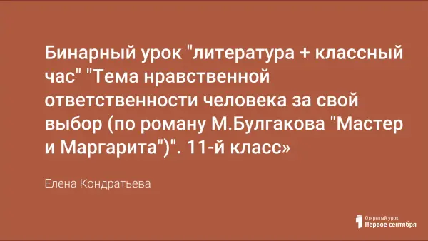 Бинарный урок доказывает важность определения нравственных ценностей для выбора жизненного пути. Роман М.Булгакова «Мастер и Маргарита» может стать для учащихся учебником жизни. При его изучении у учащихся осмысливаются нравственные уроки. На уроке старшеклассники пытаются разобраться в сложных нравственных понятиях. Формы работы: групповая, анализ ситуаций, деловая игра.