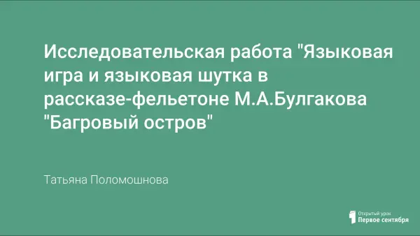 Работа нацелена на выявление способов создания языковой игры и языковой шутки на примере рассказа-фельетона «Багровый остров». Рассказ анализируется по главам. Рассматривается функция и средства реализации комического эффекта. Приводятся примеры.