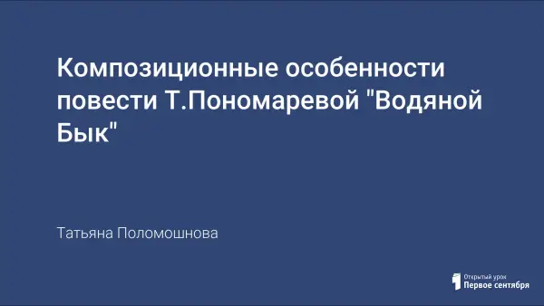 Урок направлен на знакомство с композиционными особенностями повести «Водяной Бык». Композиция повести Т.Пономаревой интересна своей самобытностью. Прочитав эту книгу, школьник вместе с героиней повести побывает и в мире обнаженной правды, где подчас трудно различить добро и зло, и в мире сказки, помогающей обрести веру в справедливость.