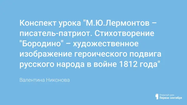 В конспекте урока представлен опыт изучения указанной темы с привлечением исторических сведений о детских годах поэта, о людях, оказавших влияние на формирование национального самосознания М.Ю.Лермонтова; рассматриваются особенности содержания стихотворения и его изобразительно-выразительные средства с привлечением репродукций художников, отразивших эпоху Отечественной войны 1812 года в своих произведениях.