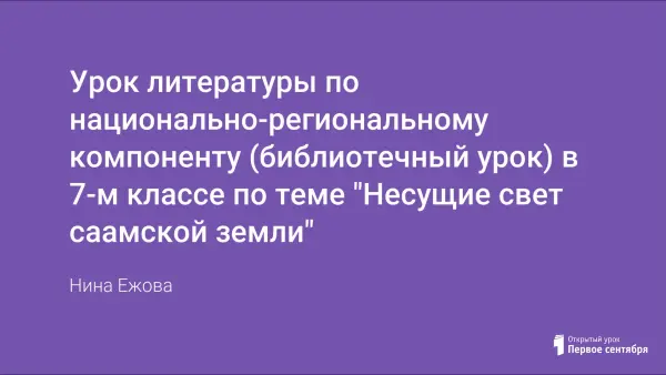 Библиотечный урок знакомит с саамской литературой, которая "...обрела свой неповторимый голос, сама тундра заговорила с читателями языком высокой поэзии" (Л.Т. Пантелеева). Данное мероприятие можно проводить как урок литературы по национально-региональному компоненту. Используется электронная презентация.
