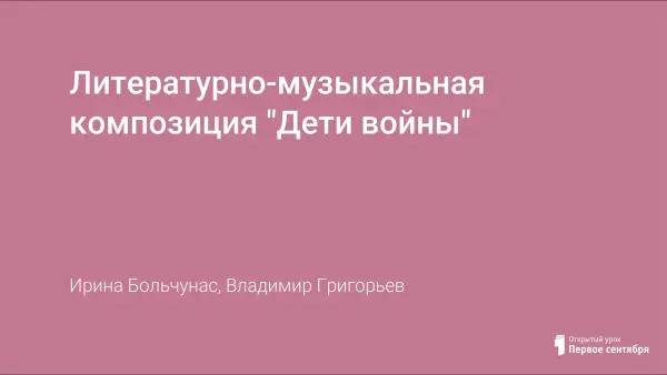 Мероприятие посвящено 65-й годовщине Победы советского народа в Великой Отечественной войне. В основу литературно-музыкальной композиции легли материалы, подготовленные к IV научно-практической конференции Заводского района города Новокузнецка по теме «Дети войны». Мы попытались на конкретных примерах показать судьбы детей военного поколения и отчасти детей блокадного Ленинграда, эвакуированных во время войны в наш город.