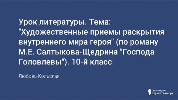 Урок литературы построен на основе анализа отдельных эпизодов произведения. В ходе работы учащиеся размышляют над тайной имени Порфирия Головлева, дают речевую и портретную характеристику героя, наблюдают за авторскими ремарками. Звучащий в классе текст художественного произведения позволяет десятиклассникам осознать современность классики и понять, что М.Е. Салтыков-Щедрин говорит с каждым из нас, «пишет не о каком-то чудовищном человеке, стоящем особняком среди людей, а о каждом из людей».
