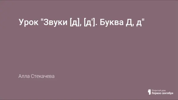Урок знакомит учеников со звуками [д], [д'], большой и маленькой буквой "д", которая обозначает эти звуки. Структура урока позволяет развивать фонематический слух, формировать у детей навыки беглого чтения. Весь урок проходит в игровой форме, сопровождается красочными иллюстрациями.
