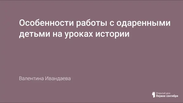 Автор излагает в статье особенности работы с одаренными детьми на уроках истории с помощью активных форм и методов обучения (разнообразные формы уроков: интегрированные, проблемные, уроки-характеристики и др.; исследовательский метод, метод проектов, информационные технологии). Все вышеперечисленные формы и методы позволяют повысить качество знаний, увеличить количество призовых мест в конкурсах и олимпиадах.