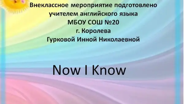 Внеклассное мероприятие проводится по окончанию учебного курса «Get Set – Go» (1-й год обучения) с целью совершенствования изученного лексико-грамматического материала. Занятие содержит элементы соревнования и литературно-музыкальную часть. В ходе мероприятия развивается познавательный интерес, творческая и мыслительная деятельность, навык активного монолога и коммуникативной компетенции, повышается интерес к изучению английского языка.