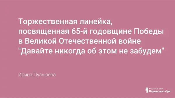Торжественная линейка, посвященная 65-й годовщине Победы в Великой Отечественной войне. Использованы методы активного и пассивного восприятия (классификация методов по источнику передачи и характеру восприятия информации Е.Я. Голант, Е.И. Перовский). Разработана для воспитанников детского дома в возрасте от 12 до 18 лет.