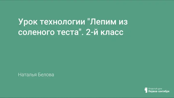 Цели урока: способствовать формированию и развитию умений и навыков при работе с соленым тестом; способствовать запоминанию основной терминологии технологических процессов; способствовать формированию представления о характерных особенностях предметов, передавать пропорции, пластику.