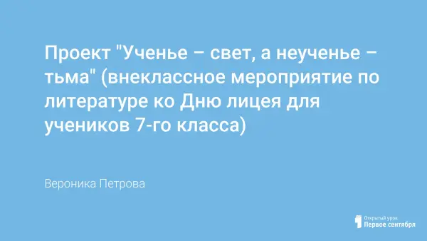19 октября в России отмечается день лицея. В МАОУ «Лицей № 161» ГО г.Уфа РБ этот день отмечается особо. Лицей №161 существует всего шестой год. Это современное учреждение в новом микрорайоне города – миллионника. Ежегодно 19 октября происходит посвящение в лицеисты первоклассников, а для остальных учеников проводятся внеклассные мероприятия по литературе. Вашему вниманию предлагается внеклассное мероприятие для учеников 7-го класса «Ученье – свет, а неученье – тьма», включающее в себя выступление учеников с рассказом об открытии Царскосельского лицея и его первых выпускниках, постановку некоторых сцен из комедии Д.И.Фонвизина «Недоросль» (по программе Г.С.Меркина данная пьеса изучается в 7-м классе в октябре).