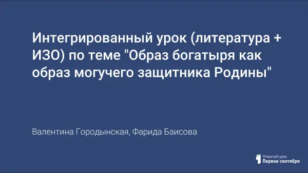 Интегрированный урок в 7-м классе обобщает и систематизирует знания учащихся об особенностях жанра былин, предусматривает исследование образа русского богатыря в литературе и живописи. При подготовке к данному уроку учащиеся разделились на группы: «Исследователи слова», «Историки», «Искусствоведы», «Художники-костюмеры». К уроку была сделана общая презентация с использованием презентаций учащихся.