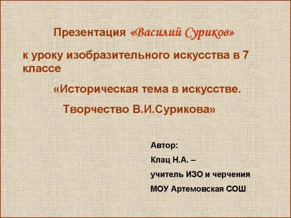 Урок-беседа по программе ИЗО В.С. Кузина знакомит учащихся с историческим жанром и страницами истории России по произведения В.И. Сурикова.