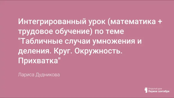 Цель урока: закреплять и совершенствовать знания, умения и навыки построения круга и окружности, определять сходства и различия круга и окружности; ознакомить учащихся с приемами выполнения петельного стежка, техническими условиями, необходимого для обработки среза прихватки, со способом пришивания петли; развивать взаимосвязь между знаниями, полученными на уроках математики, геометрии и трудового обучения.