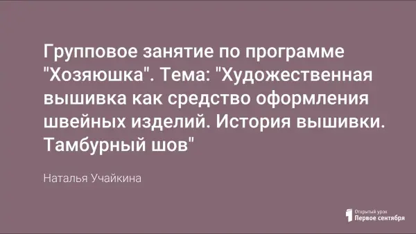 Второе занятие по художественной вышивке знакомит учащихся с историей вышивки, на нем рассказывается для чего нужна вышивка. Занятие формирует умение вышивать «тамбурным» швом, развивает внимание, усидчивость, воспитывает эстетический вкус, аккуратность, самостоятельность, интерес к искусству вышивания.