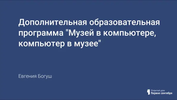 Основа предлагаемого курса – личностная, практическая и продуктивная направленность занятий, в ходе которых обучающимся предоставляется возможность личностного самоопределения и самореализации по отношению к стремительно развивающимся информационным технологиям и ресурсам. Цель программы: с помощью средств музея и информационно-коммуникативных технологий формировать творческую личность, приобщать к общечеловеческим ценностям, культурному наследию.