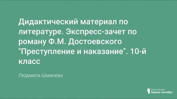 Перед учителями литературы, работающими в старших классах, часто стоит трудная задача: добиться прочтения учащимися крупных, объемных художественных произведений. Дидактический материал предназначен для проведения зачета по роману Ф.М. Достоевского «Преступление и наказание». Дидактический материал позволяет очень быстро проверить знание текста у большинства учащихся, преимущественно у тех, кто во время изучения произведения еще не успел прочитать роман или прочитал не весь.