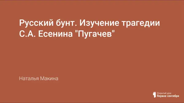 В предлагаемом материале рассматривается проблема русского бунта в ходе анализа трагедии С.А. Есенина «Пугачёв». Произведение изучается в контексте отечественной истории и литературы, проводятся параллели с «Капитанской дочкой» А.С. Пушкина, историческими и культурными событиями XX века.