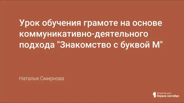 Цель урока: познакомить с новой буквой «М» и звуками, которые она обозначает; учить находить место звука в словах; читать слова с новой буквой; создать оптимальные условия для самореализации школьников; формировать способности к самоучению, саморазвитию, воспитывать коммуникативную культуру, гуманные нравственные качества, интеллектуальные, эмоциональные способности учащихся в условиях коллективной учебной деятельности.