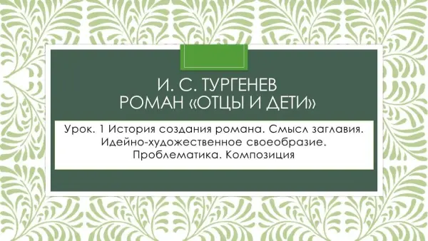 Цикл уроков литературы в 10-м классе по изучению романа И.С.Тургенева "Отцы и дети". Соответствует учебникам базового уровня и требованиям новых ФГОС. Данная разработка содержит презентации к четырём урокам и позволяет проанализировать проблематику, структуру произведения, охарактеризовать главных героев, их взаимоотношения. Презентации содержат схемы, вопросы для обсуждения и качественный иллюстративный материал.