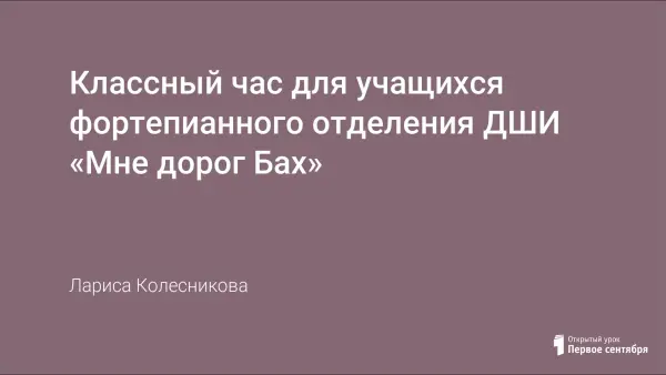 Классный час в ДШИ «Мне дорог Бах» посвящен творчеству великого немецкого композитора, произведения которого входят в репертуар юных пианистов с первых шагов. Участвуя в классном часе с элементами театрализованной постановки, учащиеся смогут ближе познакомиться и лучше понять его музыку, образное содержание которой составляют глубокая скорбь и простодушный юмор, духовное просветление и философские размышления. Она повествует о вечном, о том, что истинно и прекрасно.