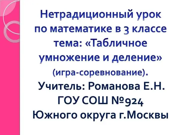 Урок позволяет повторить и закрепить табличные случаи умножения и деления. Элементы занимательности и игры способствуют развитию смекалки, логики, интереса к предмету.