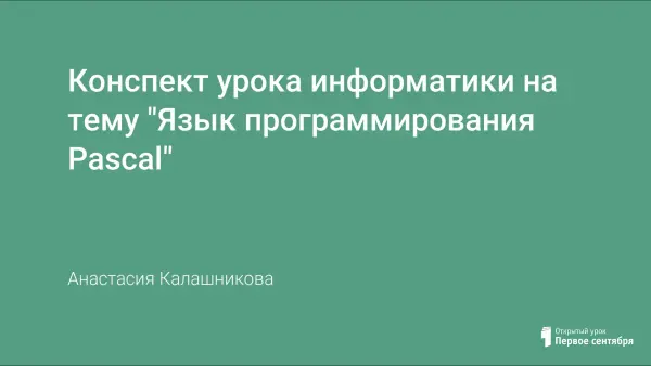 Изучение языков программирования, таких как Pascal, необходимо. Программирование вырабатывает у учащихся следующие развивающие функции: четкое логическое мышление, аккуратность и внимательность. В работе представлено первое занятие по теме "Язык программирования Pascal".