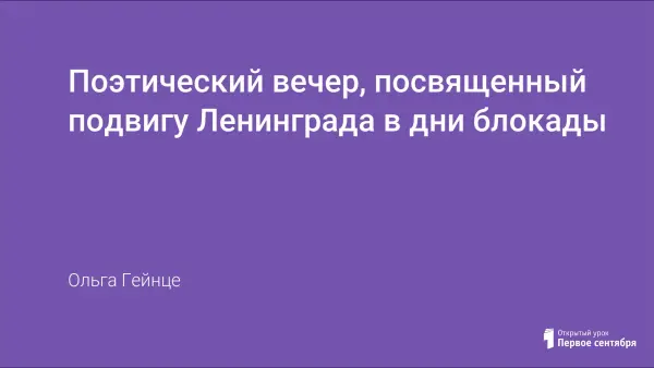 Поэтический вечер, посвященный подвигу Ленинграда в дни блокады, прививает уважительное отношение к исторической памяти своего народа; своего города, края, страны. Проводилось с воспитанниками 8–9-х классов коррекционной школы-интерната VIII вида.