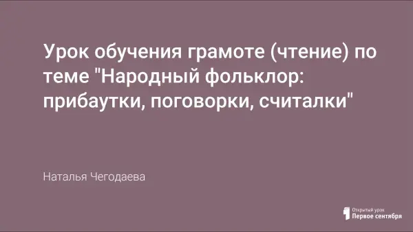 Цель урока: познакомить учащихся с произведениями устного народного творчества, понятием «фольклор»; формировать навык анализа информации; развивать речь, интонацию, артистизм; воспитывать любовь к родному языку и народной мудрости, учить видеть богатство и красоту русского языка, развивать эстетическое чувство прекрасного.