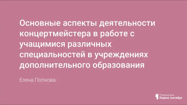 Работа концертмейстера - одна из самых распространенных профессий среди музыкантов. Концертмейстерское искусство требует высокого музыкального мастерства, художественной культуры и особого призвания. В методической статье рассматриваются основные аспекты деятельности концертмейстера в работе с учащимися различных специальностей в учреждениях дополнительного образования.