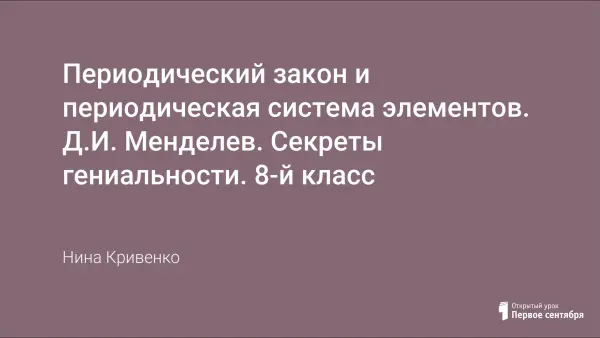 Заключительный урок по теме «Периодический закон и периодическая система элементов» – знакомство с биографией Д.И. Менделеева. На данном уроке использовался метод проектов, применялись информационно-коммуникационные технологии, элементы игры, что позволило провести урок с большой продуктивностью: на уроке заняты все учащиеся, собрана значительная информация по биографии Д.И. Менделеева.