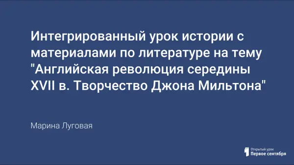 Интегрированный урок истории и литературы с информационными технологиями сочетает в себе элементы повторения и освоения новых знаний; строится на основе работы учащихся с исторической информацией об Английской буржуазной революции (1640−1653) и биографической справкой о поэте Английской революции Джоне Мильтоне. Учащиеся отрабатывают навыки отбора информации, ее обработки и анализа; развивают навык работы с историческими и биографическими источниками.
