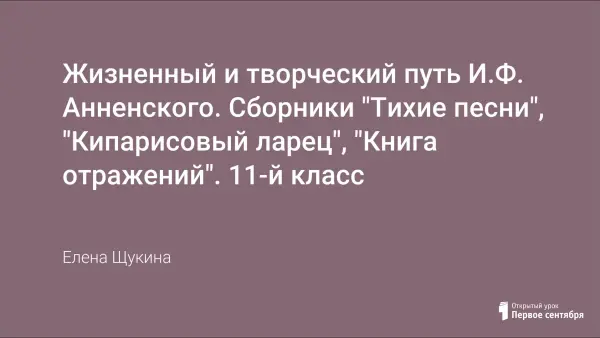 Урок рассчитан на два часа. В ходе занятия учащиеся познакомятся с биографией И.Ф. Анненского и его сборниками: «Тихие песни», «Кипарисовый ларец», «Книга отражений». Анализируют некоторые стихотворения из этого сборника и обобщают знания, полученные на уроке в лирическом эссе. Наиболее удачные творческие работы учащихся представлены в статье. Урок сопровождается презентацией, иллюстрирующей основные положения материала.