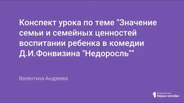 Произведение «Недоросль» Д.И.Фонвизина – благодатная почва для формирования личной позиции школьника о семье, семейных ценностях. Чтобы «раскрыть» произведение автором были сформированы цели урока: определить значение понятий «семья», «семейные ценности», проанализировать комедию с точки зрения влияния семьи и семейных ценностей; создать комфортную ситуацию для творческого выражения учащихся, способствовать осознанному отношению к семейным ценностям.