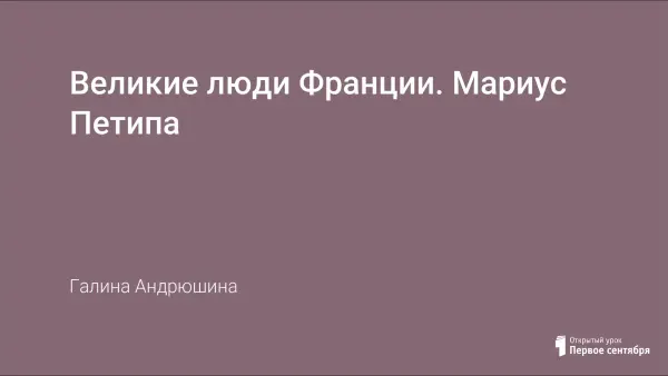 Урок посвящен творчеству Мариуса Петипа. Урок может быть полезен при изучении следующих тем: "Великие люди Франции", "Искусство", "Культурные связи между Россией и Францией", "Известные люди Марселя". На уроке используется презентация, которая расширяет социокультурные знания учащихся.