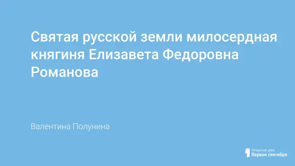 Цель занятия: обобщение и систематизация знаний о жизни преподобномученицы великой княгини Елизаветы; духовно-нравственное воспитание на примере жития святых. Занятие проводится в форме литературно-музыкальной гостиной для детей среднего школьного возраста и их родителей. Мероприятию предшествует подготовительная работа с учащимися 7-го класса по изучению жития преподобномученицы великой княгини Елизаветы, иконописных изображений святой, разучиванию стихотворений, конкурс рисунков.