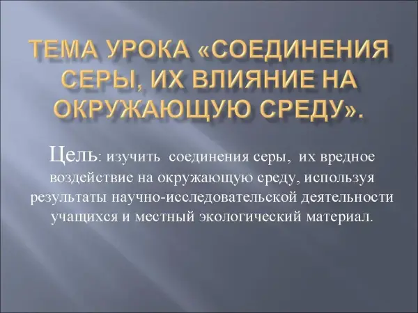 На уроке учащиеся рассмотрят на новом качественном уровне свойства соединений серы и их влияние на окружающую среду. Урок позволяет привлечь внимание к актуальным экологическим проблемам своей местности, использовать результаты научно-исследовательской работы учащихся, решать задачи с экологическим содержанием.