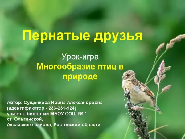 Урок «Многообразие птиц в природе» построен по принципу интеллектуальной передачи «Своя игра». Развивается познавательный интерес учащихся, анализ и синтез информации, обобщение, сравнение, установление причинно-следственных связей, расширяется кругозор.
