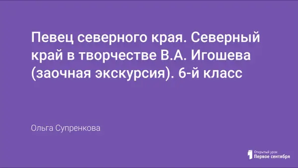 Урок построен в форме заочной экскурсии, которая знакомит с репродукциями картин народного художника В.А. Игошева. Использование на уроке иллюстративно-наглядного материала с изображением жизни и быта коренных народов севера – ханты и манси, стихов ненецкого поэта Леонида Васильевича Лупцуя воспитывает чувство прекрасного, любовь к родному краю, к малой своей родине.