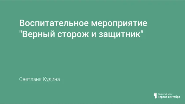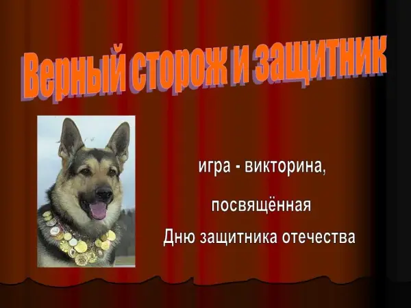 Мероприятие, посвященное Дню защитника Отечества, расширяет кругозор детей в области кинологии, знакомит с различными породами собак, их повадками, показывает роль собаки в жизни человека. Воспитывает чувство патриотизма, любовь к Родине.