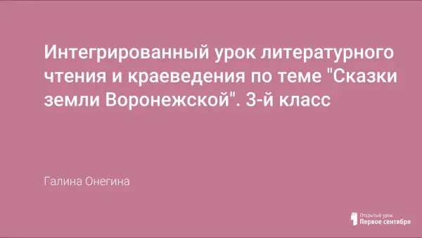 Содержание интегрированного урока соответствует программе авторского курса «Краеведение». На уроке учащиеся повторяют литературоведческие понятия (жанровое своеобразие сказки, композиция и языковые особенности), закрепляют умение классифицировать сказки, отрабатывают технику чтения, расширяют знания краеведческого материала о людях Воронежского края, посвятивших жизнь этому жанру.