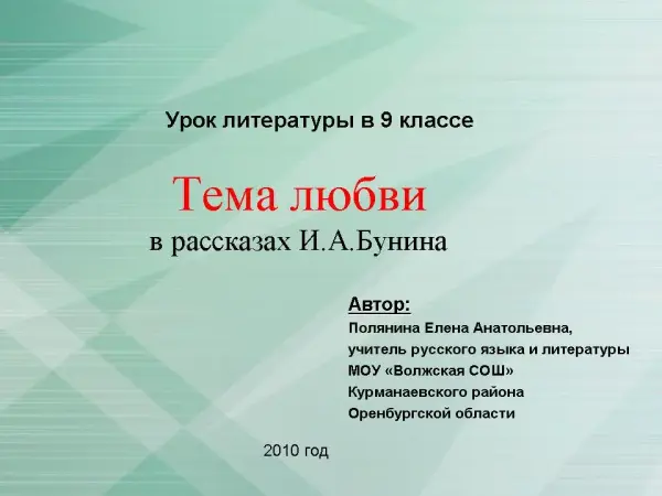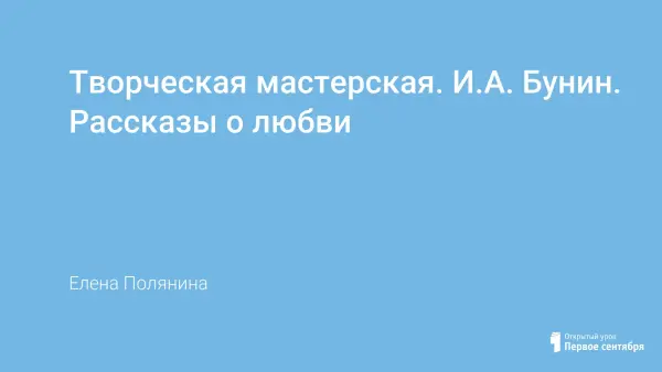 Творческая мастерская по изучению творчества И.А. Бунина в разделе «Русская литература начала XX века», реально отражает учебный план и оптимально соответствует программе. На уроке учащиеся знакомятся с рассказами о любви («Митина любовь», «Натали», «Темные аллеи»), пытаются раскрыть и понять духовный потенциал рассказов Бунина.